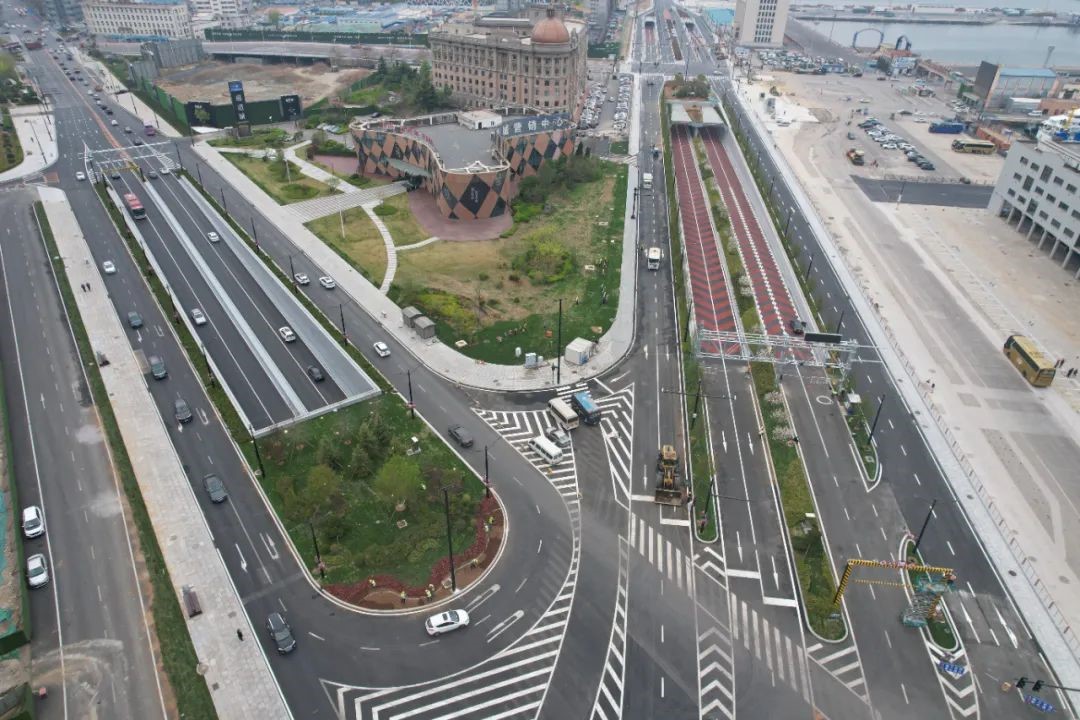 為分散項(xiàng)目對(duì)南岸老城區(qū)道路帶來的交通壓力,公司創(chuàng)造性地提出“多級(jí)分岔、三向分流”的交通組織策略,采用大型地下立交進(jìn)行交通集散,并采用融冰雪功能性路面,保障積雪冰凍條件下的陡坡段交通安全。在明挖隧道部分,創(chuàng)新性地提出從三號(hào)港池登陸,使局部結(jié)構(gòu)高出海床,大大減小基坑深度及施工風(fēng)險(xiǎn),最大程度保護(hù)碼頭、節(jié)約碼頭用地。在北岸隧道登陸段,原設(shè)計(jì)采用斜坡堤填海圍堰,為滿足國家用海政策調(diào)整后的要求,在國內(nèi)首次提出“永久防護(hù)沉箱+高樁防撞墩”形式的透水構(gòu)筑物,在隧道底部設(shè)置透水通道。