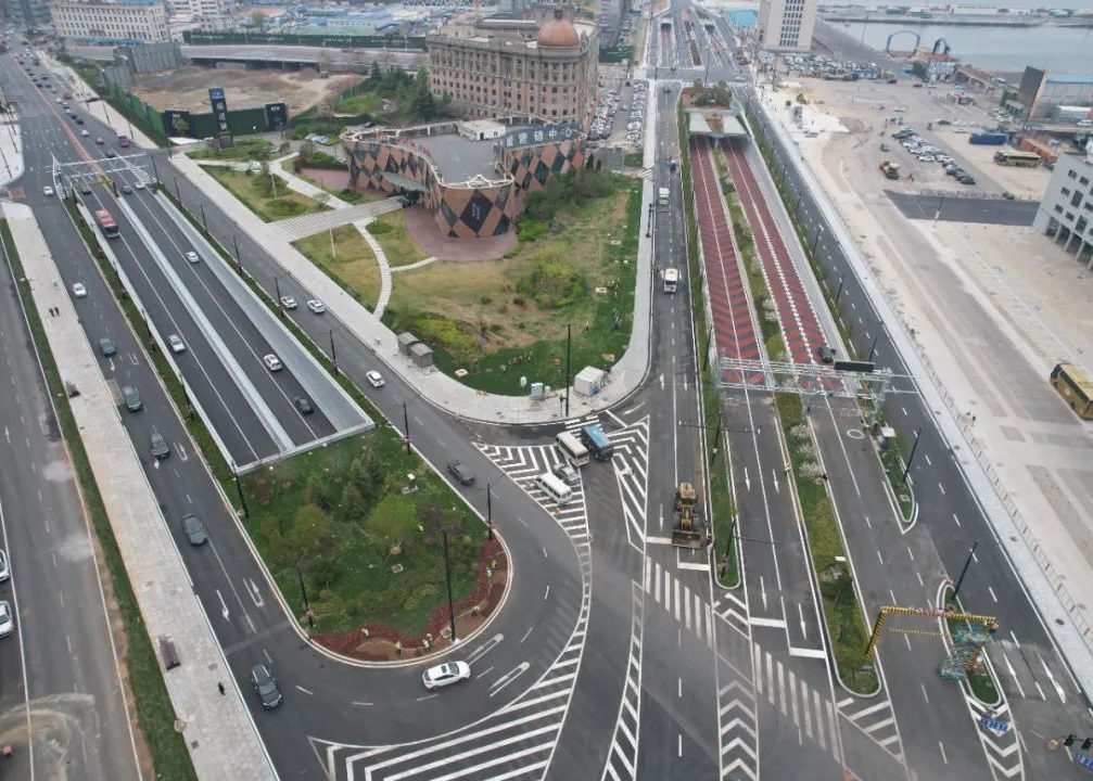 為分散項(xiàng)目對(duì)南岸老城區(qū)道路帶來(lái)的交通壓力,公司創(chuàng)造性地提出“多級(jí)分岔、三向分流”的交通組織策略,采用大型地下立交進(jìn)行交通集散,并采用融冰雪功能性路面,保障積雪冰凍條件下的陡坡段交通安全。在明挖隧道部分,創(chuàng)新性地提出從三號(hào)港池登陸,使局部結(jié)構(gòu)高出海床,大大減小基坑深度及施工風(fēng)險(xiǎn),最大程度保護(hù)碼頭、節(jié)約碼頭用地。在北岸隧道登陸段,原設(shè)計(jì)采用斜坡堤填海圍堰,為滿足國(guó)家用海政策調(diào)整后的要求,在國(guó)內(nèi)首次提出“永久防護(hù)沉箱+高樁防撞墩”形式的透水構(gòu)筑物,在隧道底部設(shè)置透水通道。